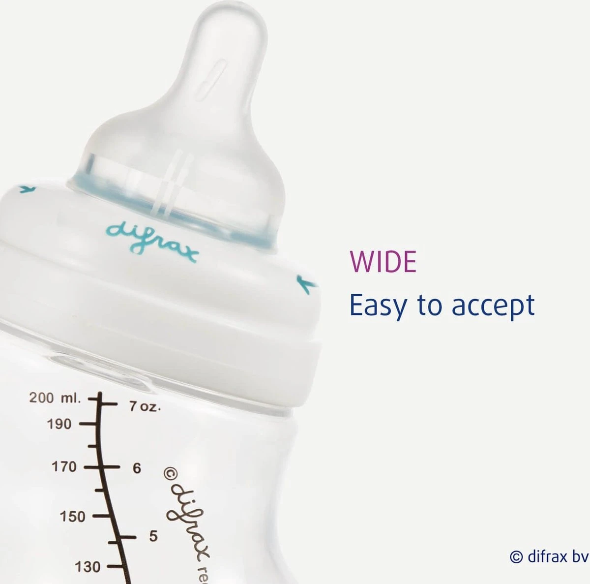 Met de Difrax 1-2-3 Ring Wide positioneer je de 1-2-3 Doseerspeen Wide op de S-babyflessen Wide van Difrax. De 1-2-3 Doseerspeen is geschikt voor dunne en dikke voeding en te gebruiken vanaf 3 maanden. Ideaal voor wanneer je kindje melkvoeding krijgt maar ook een papfles.