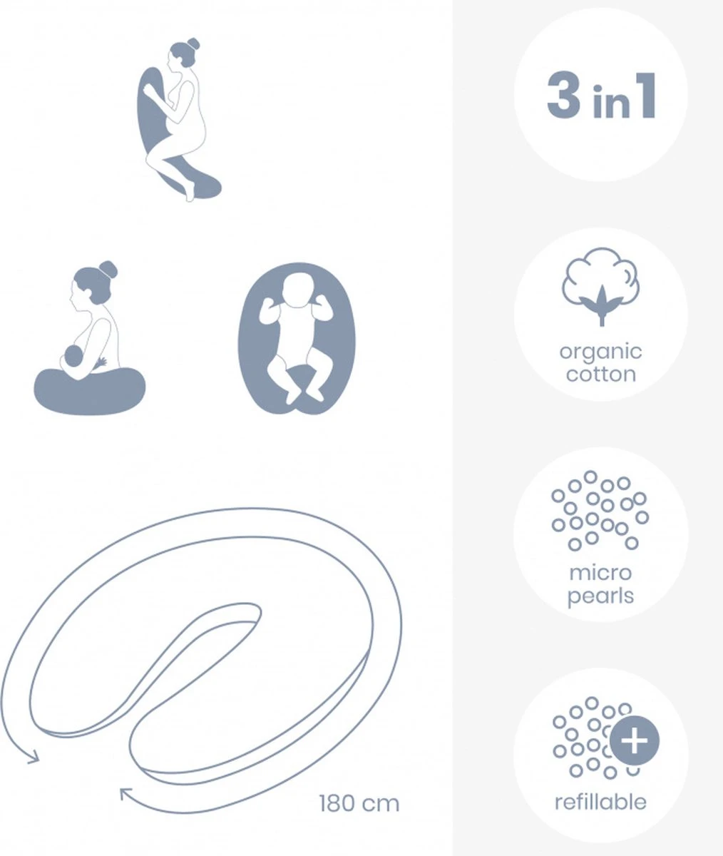 Het doomoo Buddy voedingskussen is heel comfortabel dankzij de elastische hoes in superzacht biokatoen en de vulling van superfijne microkorrels.