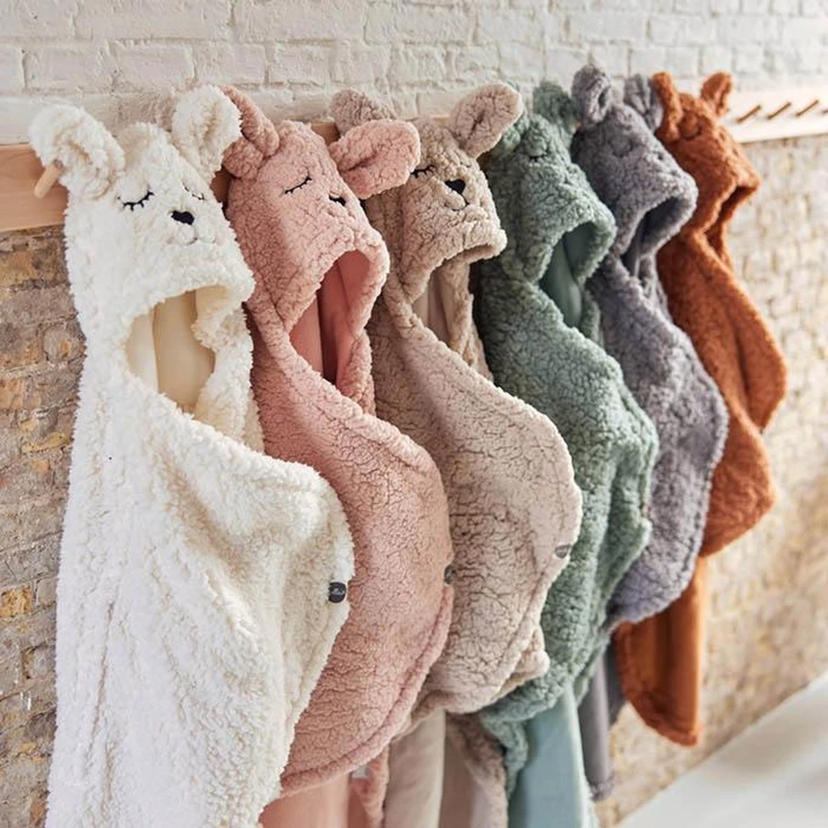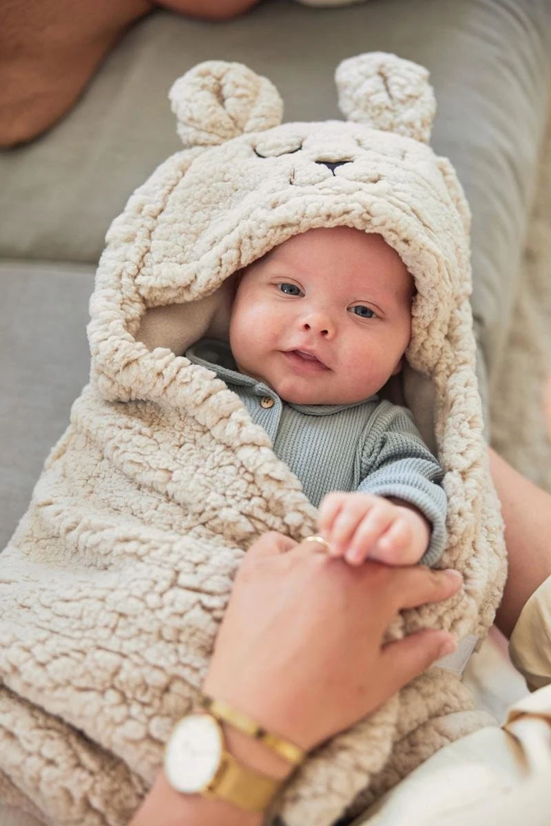 Wikkeldeken met gegarandeerd mega hoge cutenessfactor. De stof is van fluffly vachtlook aan de buitenkant en heerlijk comfortabel zacht aan de binnenkant.