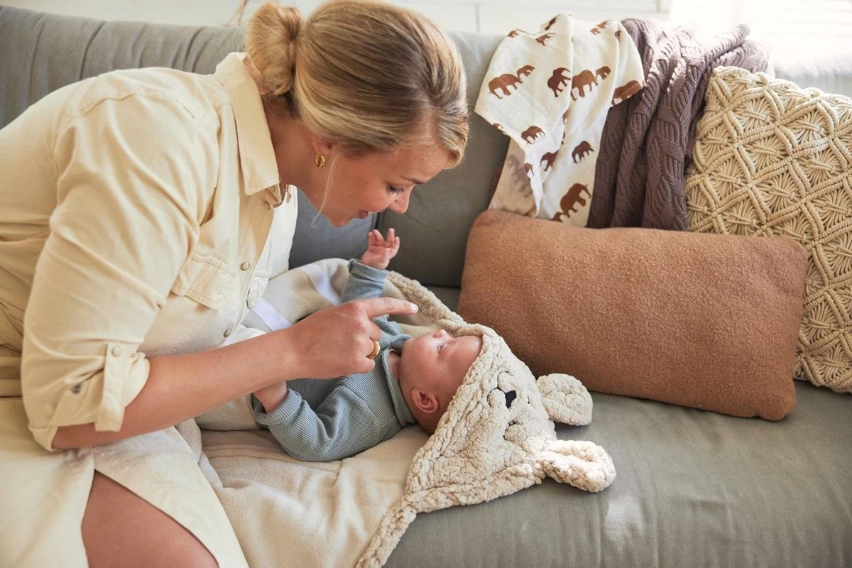 Wikkel je baby in deze omslagdoek en sluit de deken met de praktische klittenbandstroken. Zet het mutsje erbij op en zie daar, die schattige oortjes en dito konijnengezichtje op het mutsje. Echt te lief!