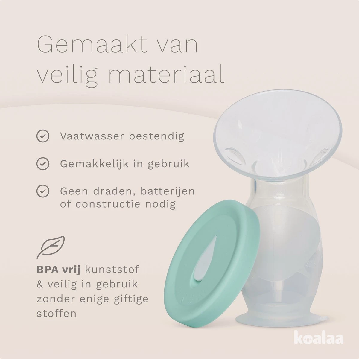 De Koalaa handkolf is vervaardigd van hoogwaardige siliconen, de siliconen zijn zacht en voelen comfortabel aan op de borst. De borstkolf heeft een perfecte pasvorm zodat deze altijd goed aansluit rond de borst en comfortabel aanvoelt. De siliconen zijn bovendien vrij van BPA en andere gifstoffen zoals, PVC, ftalaten en bleekmiddelen. Je kunt de borstkolf dus met een gerust hart gebruiken.