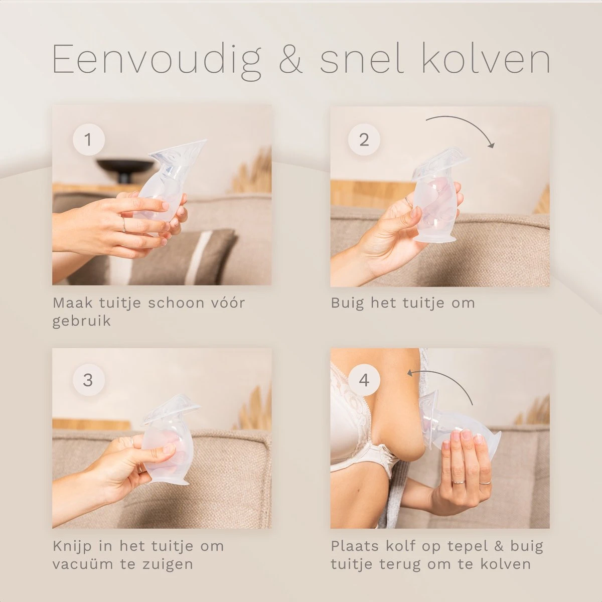 ▶ Hoe werkt het? – De siliconen borstkolf van Koalaa werkt middels vacuüm waardoor het toeschietreflex wordt gestimuleerd. Je plaatst de kolf rond je borst waarna je enkel een paar keer moet knijpen tot de kolf vacuüm is getrokken, de kolf zal de rest voor jou doen. Je hoeft dus niet zelf met de hand te kolven, sit back and relax!