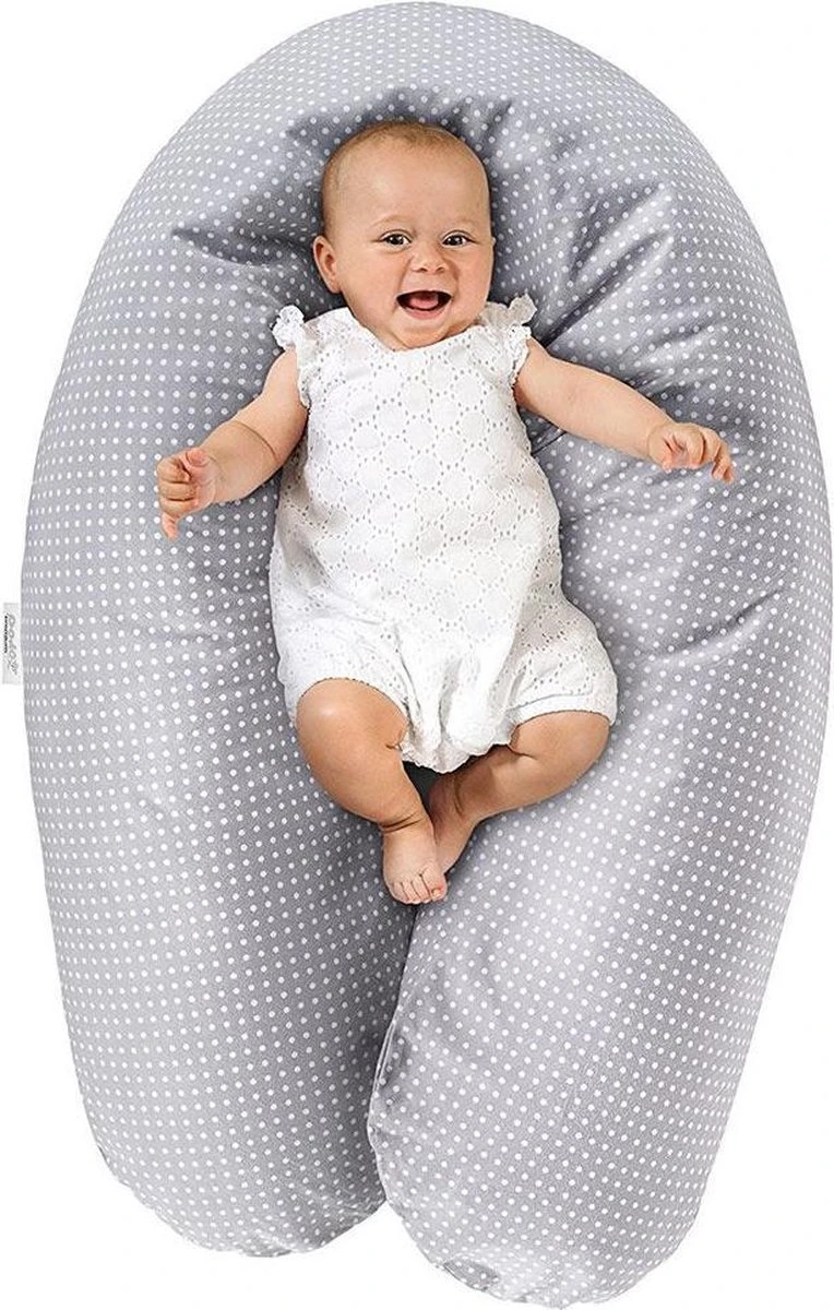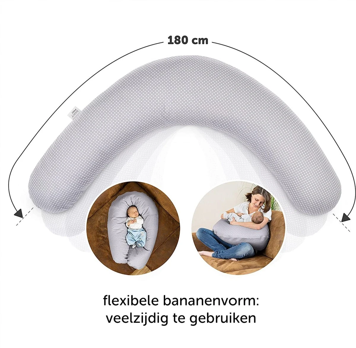 - Ergonomisch – Het soepele 180 cm lange positioneringskussen ondersteunt je rug en buik tijdens de zwangerschap en biedt comfort tijdens het geven van borst- en flesvoeding. Het kan ook als babynestje worden gebruikt.